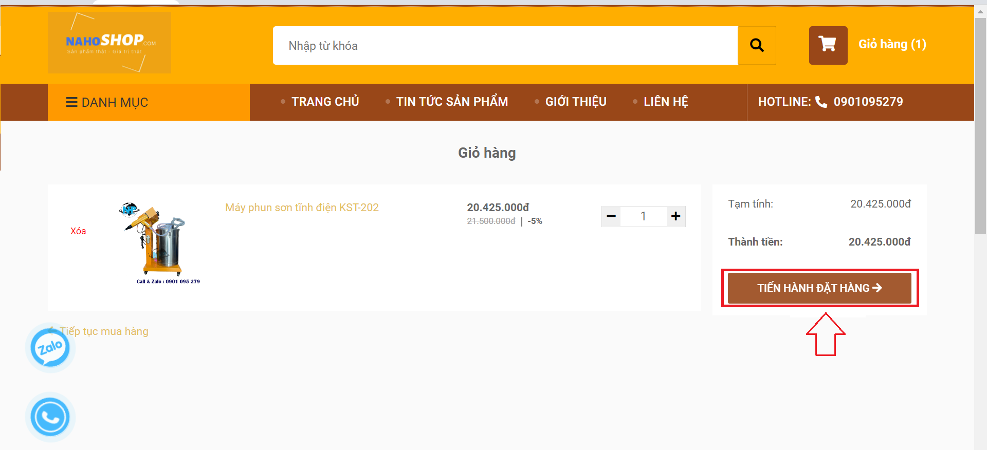 Chọn sản phẩm vào giỏ hàng và bấm tiến hành đặt hàng như hình trên.