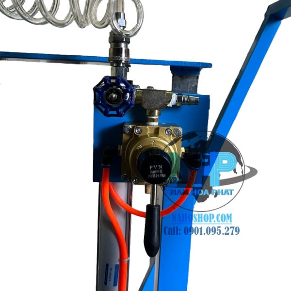 Phần khung máy và nâng hạ: Khung máy được thiết kế tiện lợi, có bánh xe giúp việc di chuyển trở nên thuận tiện hơn, máy khuấy trộn hóa chất nâng hạ tự động được trang bị xi lanh hành trình khí nén từ 0.5 mét đến 1.5 mét tùy vào kích thước các loại bồn sử dụng để khuấy, với loại phuy 200L thông dụng sẽ sử dụng xi lanh hành trình dài 1 mét.