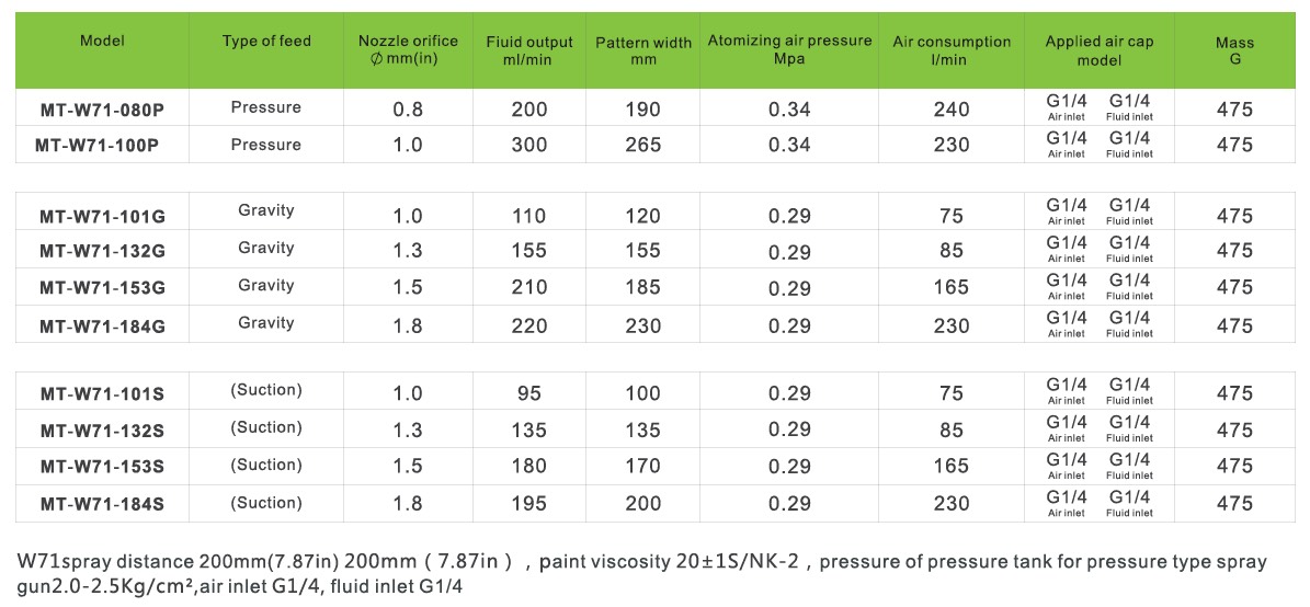 Bảng thông số kỹ thuật súng phun sơn Meiti MT-W71 :